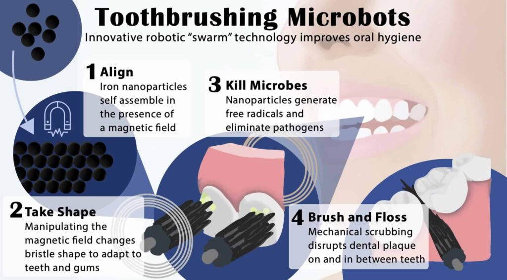 However, in a world first, researchers at the University of Pennsylvania have developed technology which uses a magnetic field to direct iron oxide nanoparticle-based microrobots which can change shape to form bristles for brushing or slide between your teeth to floss them including releasing an antimicrobial substance that eliminates dangerous oral bacteria from your mouth.
